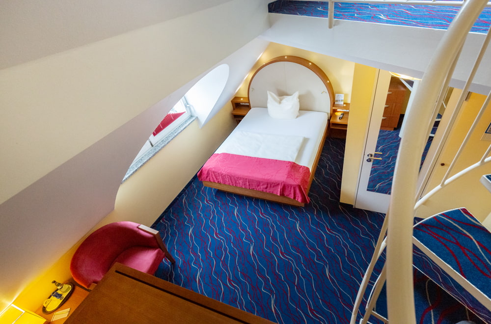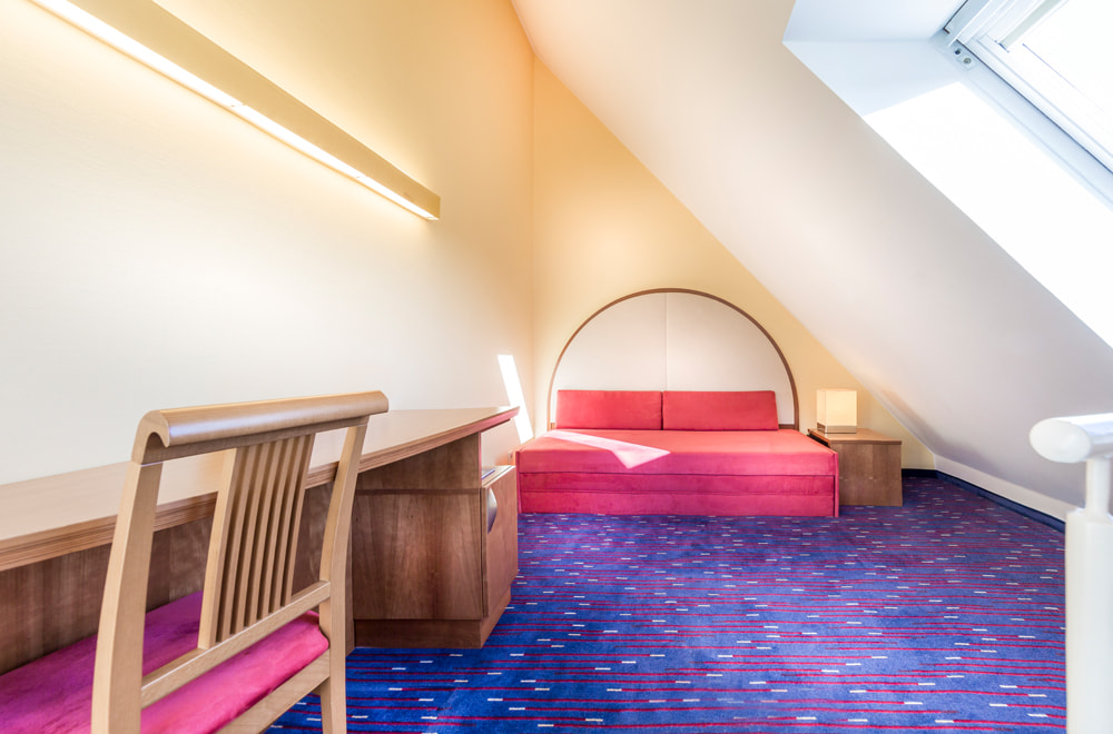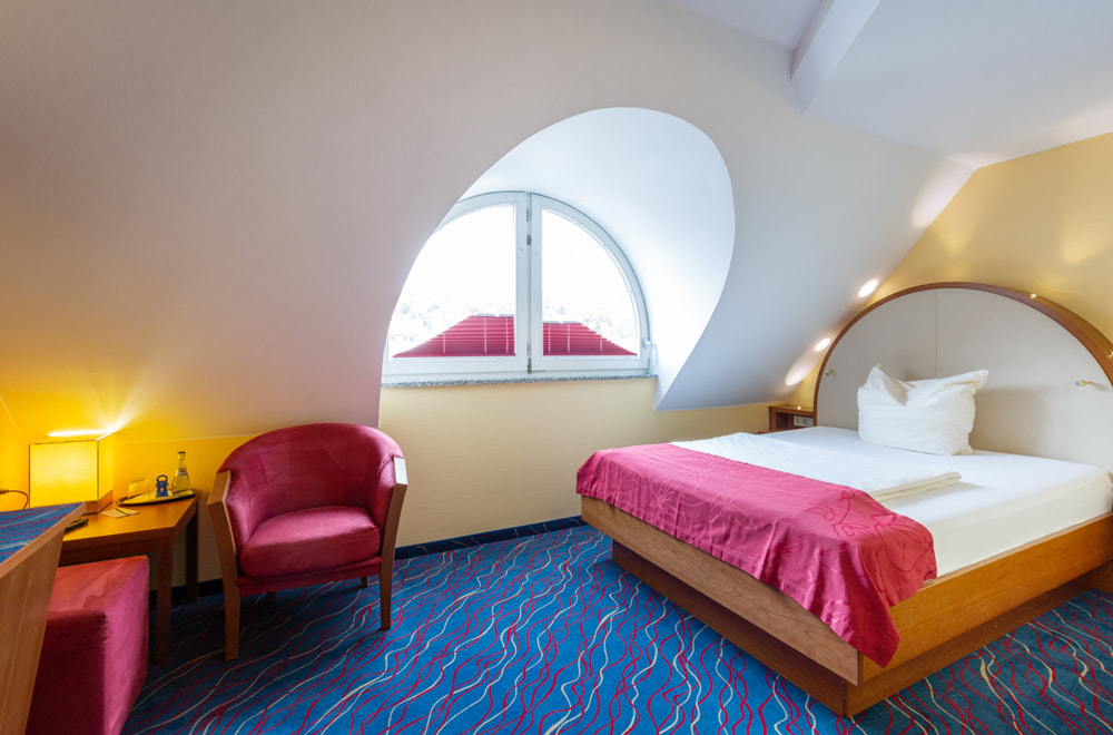 Die Zimmergröße, ab 28 qm, sind mit einem franz. Bett in der Größe von 160x200 in Komforthöhe ausgestattet. Das Zimmer bietet Schreibtisch, Flat-TV , Fön, W-Lan, Telefon und digitalem Hotelservice. Teilweise mit Minibar, oder auf Wunsch mit passend aufgefüllter mobilen Minibar.